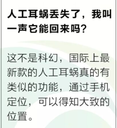 2019年4月10日這是一個新型的欄目<br /> 一本正經地奇思妙想<br /> 內容全靠一張圖<br /> 言語僅僅三兩句<br /> 大家隨便看看就行了<br /> 可一定得往心里去啊<br /><br /></span><div style="text-align: center;"><img src="/upfiles/20190410093258759.jpg" alt="" /></div> 嚴肅點:幾乎每個月,都有人工耳蝸丟失的事件發生,每一次都會成為該地方新聞的焦點。<br /> 無論我們多么小心,不經意間的疏忽總會造成大麻煩。對于遺失耳蝸的家庭來說,一方面要承擔一筆不少的購機費用,另一方面會有一段時間的“聽力真空期”,我們不禁感嘆,要是耳蝸能自己報告位置就好了。<br /> 實際上這并非空想,國際某品牌人工耳蝸的最新設備已經可以實現遺失位置定位,通過手機,我們可以找到處理器所在的大致位置(如果你有興趣,可以留言交流)。<br /> 5G時代,萬物互聯,遺失定位也是未來人工耳蝸產品設計的趨勢之一,未來小伙伴們就可以體驗這種技術啦。<br /> 相關推薦閱讀:<a href="http://m.hljhqw.com/listDetail.aspx?id=102609" target="_blank"><strong><span style="color:#3333ff;">保如果世界上沒有聽力設備:助聽器和耳蝸。</span></strong></a><br /><br /><br /> 聽覺有道助聽器價格:http://m.hljhqw.com/products.html<br /><br /><br /> 發布于2019年4月10日 星期三<br /> 上午9:33分" />
