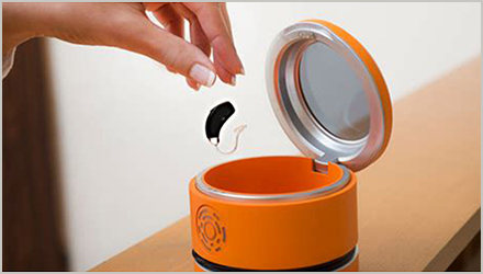 然后打開電池倉門取出電池,把助聽器放置在干燥盒中(切忌使用微波爐、電吹風),等待幾小時或一晚上。