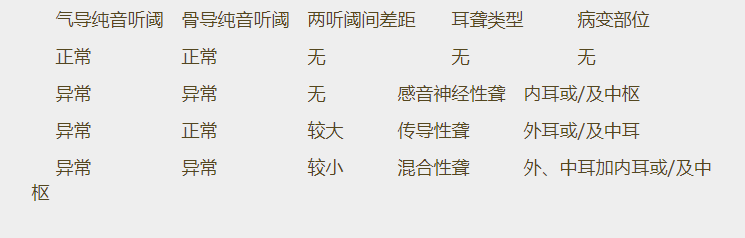 純音聽力檢查結(jié)果體現(xiàn)為純音聽力圖。</p><p> 正常情況下我們是通過兩條途徑來感受聲音信號的——氣導(dǎo)途徑和骨導(dǎo)途徑。前者我們非常熟悉,從外耳到中耳到內(nèi)耳到聽中樞;后者我們或許不太注意:從顱骨直接到內(nèi)耳到聽中樞。相應(yīng)地,純音聽力檢查也有兩種聲音剌激方式,氣導(dǎo)輸入和骨導(dǎo)輸入。前者我們天天使用,而后者則很少被我們使用。事實上,兩閾值曲線的異同正是我們判斷聽損病變部位的基礎(chǔ)(見下表)。了解患者病變部位對于獲得他們的信任以及確定助聽器電聲性能都有非同尋常的意義。因此,有條件的時候還是應(yīng)當(dāng)重視骨導(dǎo)聽閾測試。</p><p style="text-align: center;"><img src="/upfiles/201906100237368907.png" alt="" /><br /></p><p> 更多詳情請登錄聽覺有道助聽器m.hljhqw.com</p>" />